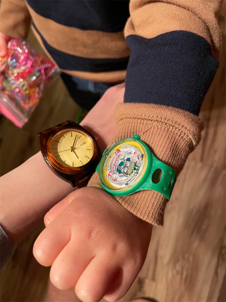 買ってすぐ、腕につけてくれと言ってくるのでつけるとご満悦の表情。「ママのといっしょ!」とか言ってくるのでめちゃかわ。