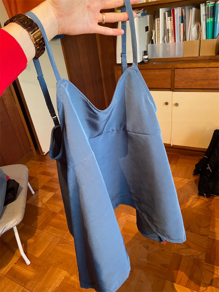 今日は薄い生地で自分のキャミソールを作ってみた。Tシャツとかの上に着るやつ。